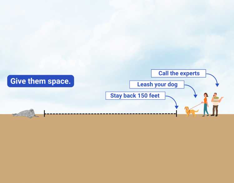 Whether you are observing healthy seals or reporting an animal in distress, make sure to give marine mammals at least 50 yards of space (150 feet, or half a football field). Protect wildlife by not approaching, touching, picking up or feeding the animal. If an animal reacts to your presence, move farther away.