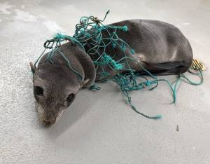 Guadalupe fur seal Snaggle was found with brightly colored netting wrapped tightly around his neck and body. He could barely open his mouth, so the entanglement likely left him unable to swim well enough to catch food. Weak and fatigued, he was on the brink of what would have been a devastating fate.